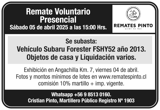 Cristian Pinto Mayorga, Martillero Público Registro Nº 1903